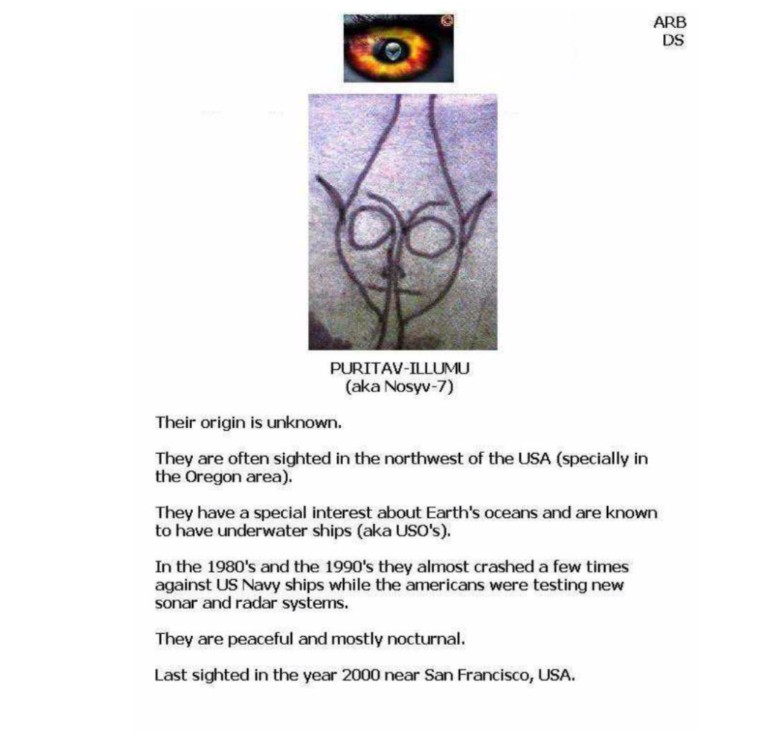 PURIT AV-ILLUMU These amphibian beings not only appear in the work of Elena Danaan (9, p.294-295), but also in the Russian book of Aliens (11,12). At page 323 we can read something interesting related to their role in a number of underwater bases: “Amphibian Grey humanoids watchers for the Galactic Federation of Worlds (13), monitoring oceans and the access to oceanic interdimensional portals. Three huge bases in vast suboceanic facilities in North Atlantic, Baltic Sea and Northern Sea.” (9, p.323).