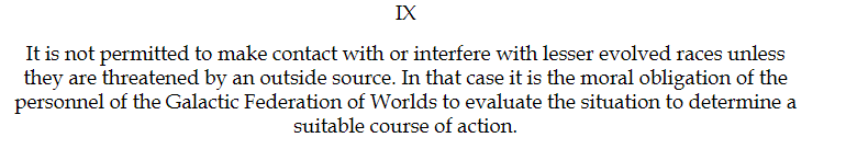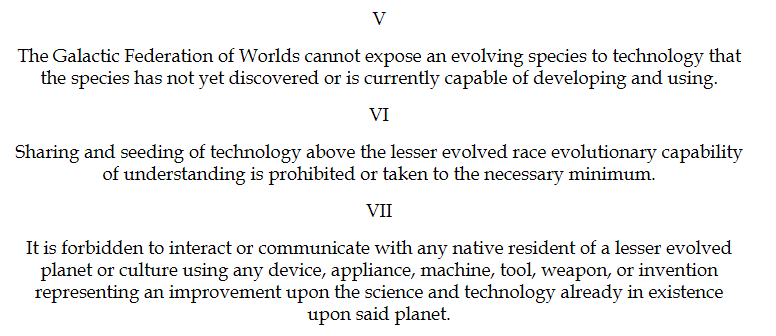 In September 2021 the Galactic Federation of Worlds released its Prime Directive, which is described as a moral, ethical guide and legal template, applicable to all cultures in any world that have not yet achieved interstellar travel capacity and have not established an organized continuous relationship with an evolved external interstellar culture. (4)