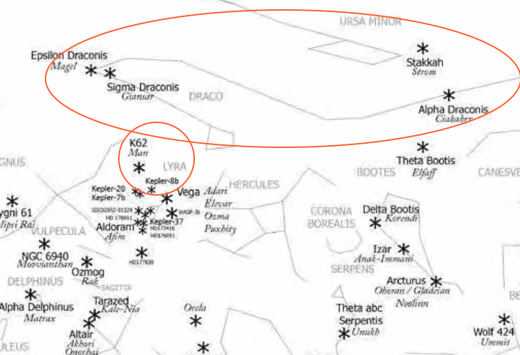 So, there we have these regressive Draconians or Ciakahrr in the Alpha Draconis system (4), and guess what? Humanity would have been seeded in the Lyra system, which is awfully close to the Draco’s habitat. Below you can see a part of the star map from ‘A Gift from the Stars’ (5)