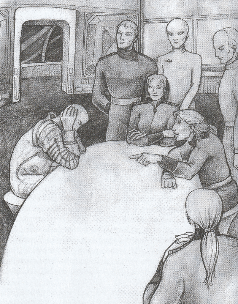 “Russian ISS personnel taken onboard the station of the Galactic Federation. I could identify High Commander Ardaana in the background and Thor Han across from the astronaut”