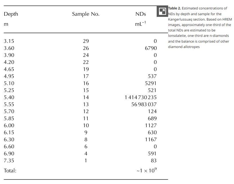 Table 2. Estimated concentrations of NDs by depth and sample for the Kangerlussuaq section. Based on HREM images, approximately one-third of the total NDs are estimated to be lonsdaleite, one-third are n-diamonds and the balance is comprised of other diamond allotropes (see 4)