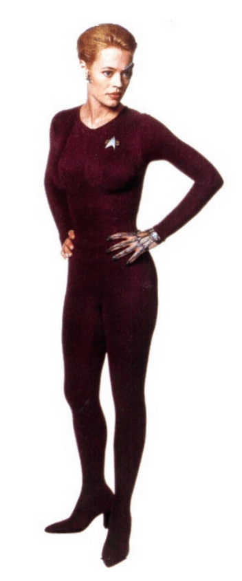 Seven of Nine from Star Trek Voyager (fictional), wearing a suit that seems to be quite common amongst the Galactic Federation of Worlds (not fictional) (without a belt though) (11)