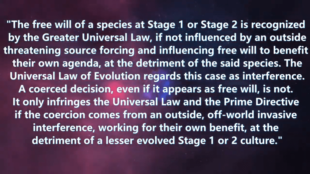 All the members of the Galactic Federation of Worlds need to respect the prime directive (17), which can be regarded as a kind of universal law related to how to deal with different cultures on other planets, especially civilizations that have a lesser stage of development (see image above). There was a change in the Prime Directive in 2022 (18). What is important is that the GFW is not here to save us. They stress that it our job to clean up the mess caused by the Cabal and their malevolent extraterrestrial overlords. Their task was to remove these malevolent ET’s from the equations, but we need to finish the task ourselves, as Ardaana said, we need to put the last stone on the monument (19,20)