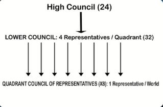 In an interview on a channel called ‘UFO MAN’, Elena was asked about the way the members of the GFW were elected. She also says that every single culture is represented in the Lower Council (She probably meant the Quandrant Council, see scheme above). She also says that there might be hundreds of thousands of representatives.