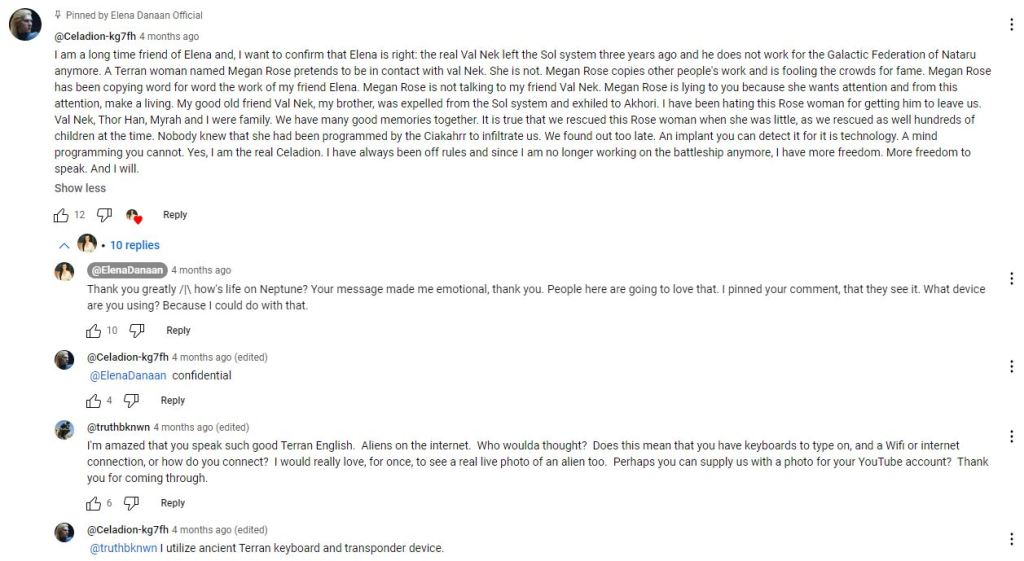 “Oh my gosh, I was shown just right now the interstellar object 3E Atlas up close. It may seem incredible, but I am an ET contactee. My name is Elena Danaan, and I have been abducted at 9 years old, rescued by tall blonde Nordic type extraterrestrials working for the Federation of Worlds, Galactic Federation of Worlds (10), okay. They have an implant, there’s an implant in my head that allows me to communicate with them like a walkie-talkie. And also the threads of this implant are plugged with my nervous system and my optic nerves, so we can exchange sights, you know. I can see through my contact’s eyes, and he can see through mine.